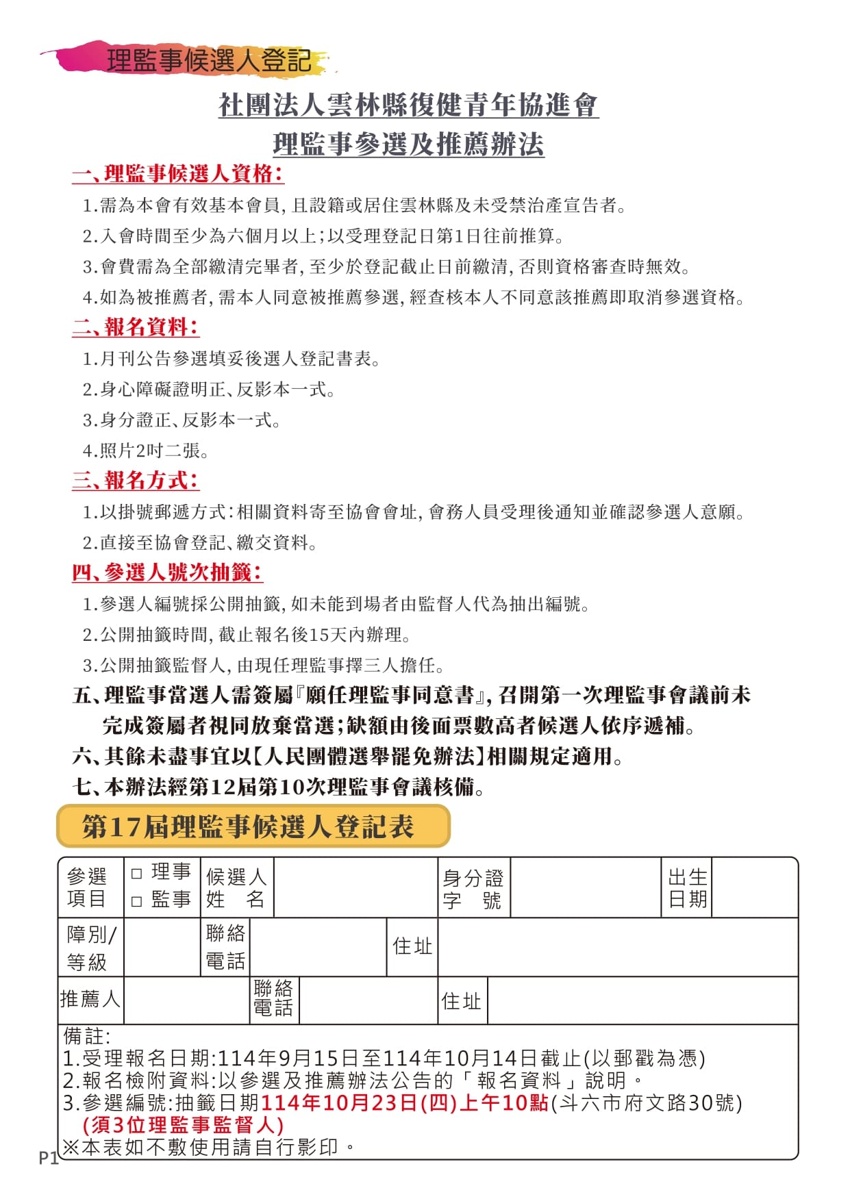 【公告】第17屆理監事候選人登記報名,登記報名日期:114年9月15~10月14日